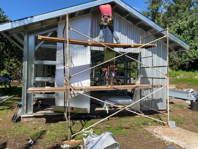 The lumber arrived to separate the tool shed from the library and the end panels are being put on so it will soon have walls. Yesterday I had lunch in the shed with the builder Chris, his helper Daylan, and Haumana.