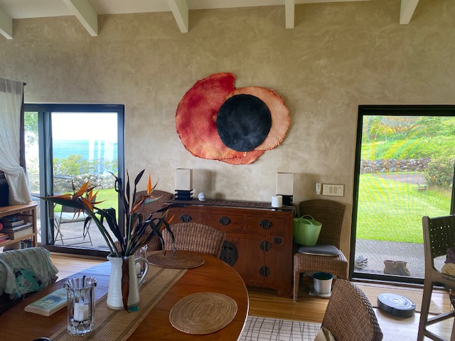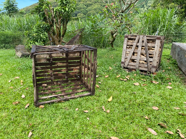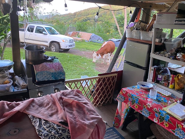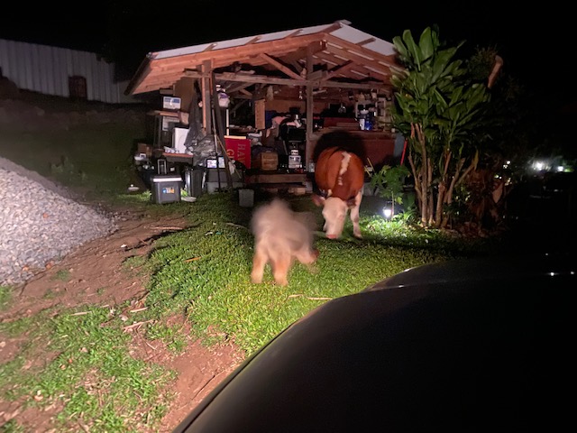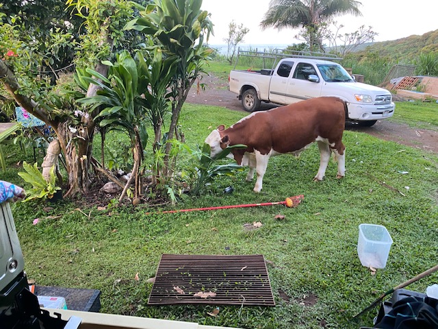 Karen took me to her yoga class with Crystal on Monday and a delicious fish dinner at her house on Monday night. I had a big scarey surprise coming home in the dark after dinner. I had forgotten to take my flashlight and when I pulled up in front of the camp house the dogs were barking. I could tell that someone or something was here. For a few minutes I just stood by the back of the truck in the dark breathing deeply and hoping to heck it was not a person. Then I used the light on my phone to shine in the general direction and there was a big brown and white cow right at the front entry. Upon a second glance I realized the cow belonged to the neighbors Patty and Walt and it had broken through the neighboring fence in the pasture. Big relief, but it was eating my ti leaves. I called Patty and she came down but we both realized we had to wait till morning to get it back home. I got Mana contained in the house so she wouldn’t get kicked but the cow was outside all night munching on the leaves and the dogs were going crazy barking most of the sleepless night. Patty and Walt came early Tuesday morning and after him running all over the property (also pooing) They got him back through the fence into the pasture.