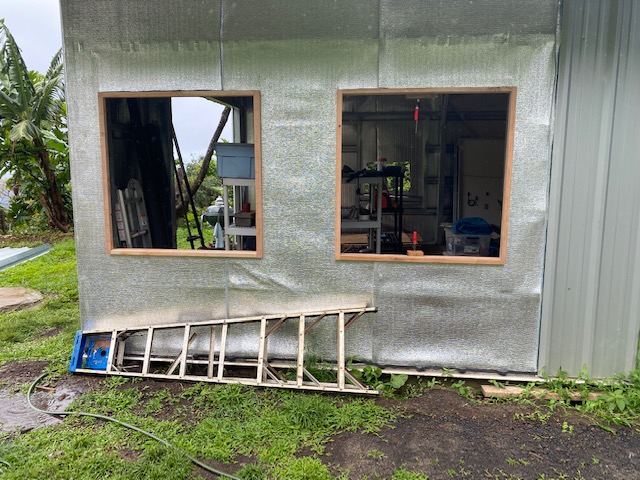We had a big two night rain and it was a short three day week for building, but the wooden window frames are now mostly all made and will be installed this next week. Then when the windows and doors finally arrive they can be just pop into the frames and voila! Nothing got moved this week, but I have high hopes for this next week with the promise of Bradley coming to move the plastic tool shed and then moving the water tank. Chris will bring his machine to grade the yard and take out a tree stump then the wooden fence can go up and the Brazilian cherry and Suriname cherry trees can be planted for a visual barrier on the ugly metal pasture fence side. It seems every project depends on another so it is a waiting game here. But, slowly but surely it is happening.
