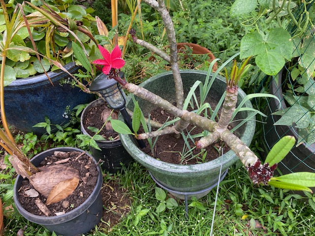 The weeks are rolling around pretty swiftly now and it seems before I know it Saturday is approaching and it is time for another blog. It has been an interesting week here in paradise. I woke up early this morning to the pitter patter of rain on the roof and gentle breezes flowing through the wallless camp house. I welcome this rain for filling up the water tank and planting. In the next days I hope to get a bodi tree in the ground as well as five pakalana and the sweet potato plants my neighbors Nick and Sutton gave me last Saturday. I made a zinnia garden this week and the rain nurtures the young plants. I had to rig up some fencing as the cats were getting into the soft ground and digging the seedlings up. I have been trying to grow a red plumeria for years with no success. To my amazement this week a red flower opened up on a potted plumeria brought from Oahu.