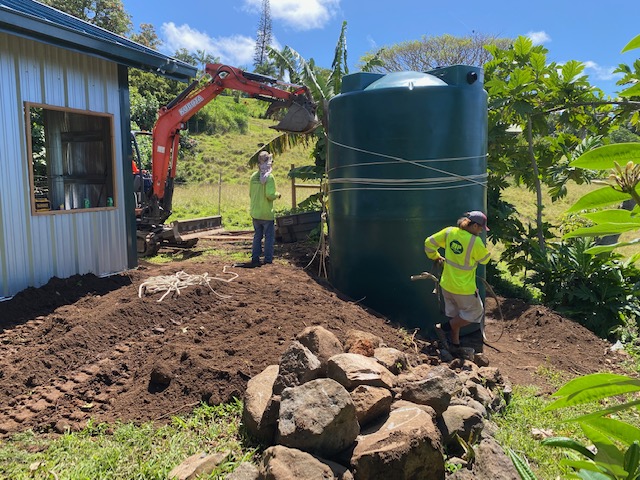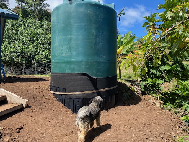 This week has also been mainly about placement of the water tank which has taken more time than planned. Three whole days were spent wrestling with the 5,000 gallon dark green towering water tank. Some how we had not planned that the tank would be so high. When the tank was set up last week it was actually several feet above the gutters that will feed it with rain water from the roof. In order to make this happen the tank had to be relocated and a hole dug in order to reset it. The tank seems about twenty feet tall with nothing to grab on to so it was a real amazing job getting it level and in place. Afterwards Chris made some steps for me to use out of the old growth cedar planks.