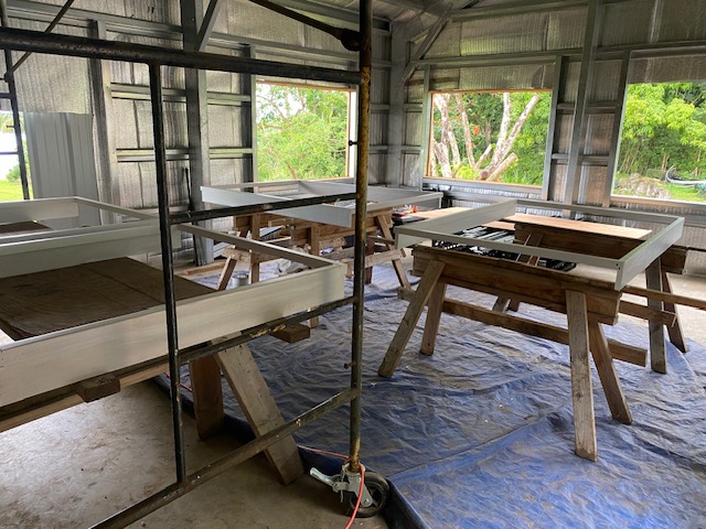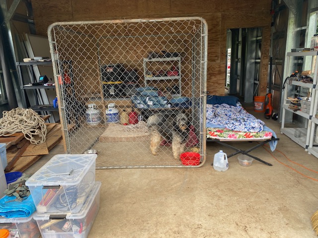 At first the vet thought she might have to go back to Oahu for surgery, but she suggested cage rest and return in two weeks for another X ray. Keeping miss Mana in a cage is a sad and difficult situation that requires a lot of special attention with frequent short leash outings for her pees and poops. Luckily I have four six foot fence panels that the carpenters put together in the back open part of the shed. She has a great view of the cows and pasture and Ehu along with the cats can come and go to visit her. I set up a cot next to the cage and have been sleeping here with her so she doesn’t feel abandoned. Hopefully the next X-rays show some healing. She does not seem to be in pain so I am keeping a positive thought we will survive this set back. It is just hard when your best girl friend is laid up.