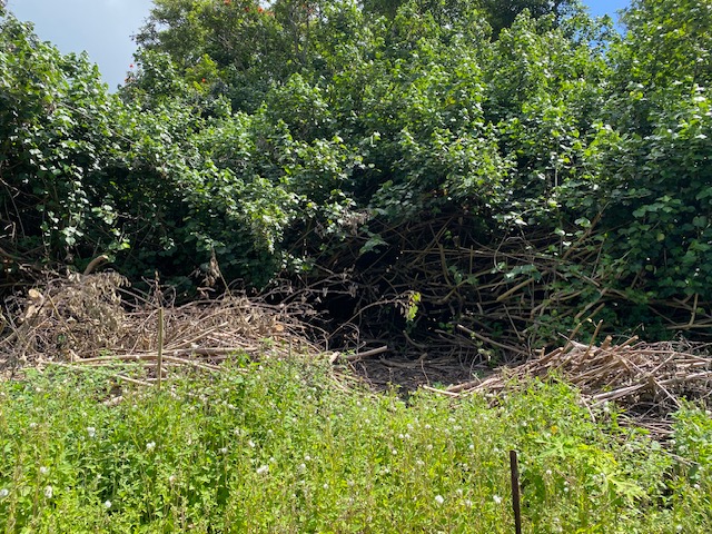 Plans are to have this property blessed in early August when both my daughters Marcie and Rennie visit, along with other friends, who will be here for the blessing event. Part of the blessing hopefully can be filmed. And speaking of film, the next film segment about the niu (coconut) projects will be filmed here in late August. Hopefully you have all watched the YouTube film Kumu Niu so you are familiar with our proposed project here. I am working on getting the next lo’i cleared of hau in-order for space to start the first coconut planting. This hau is difficult stuff to clear particularly with invasive tulip trees interspersed. Bradley came yesterday to cut four tulips so we can proceed on the hau. Plans are to bring a chipper in next month to start the process.