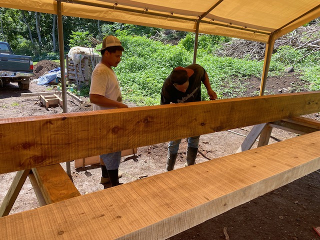 Finally the huge heavy old growth cedar beams have come out from under the tarp in the front yard. The guys dug specific sizes out of the wood pile, sanding them lightly and putting two coats of Cetol stain on them. They are looking rich and beautiful just like I imagined. I bought a pile of these beams from a man who years ago had them milled specially in Vancouver. He built a gorgeous multi million dollar cedar house on Lanae. When he sold the house the extra cedar all had to go. Luckily through mutual friends I was able to buy the whole package sight unseen and I ended up with a treasure trove of building materials. These beams will be used for the patio uprights with four keawe posts to support them. All this has to be installed before the gutters can be put on the shed.