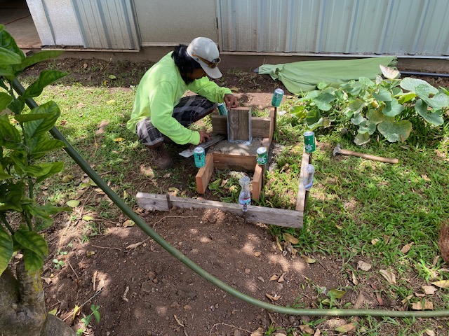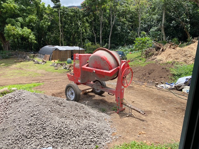 Meanwhile the post holes were being prepared with rebar for the upright kiawe posts. The first concrete pour took place on Wednesday.