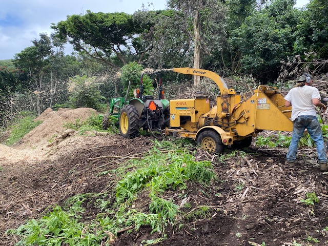 Over the past months there have been many piles of cut hau accumulating waiting to be chipped. Early Monday morning Ryan from Whispering Winds showed up on his John Deere tractor hauling his large chipper. Bradley’s four boys were here and seven men were pulling the hau out of piles and feeding the chipper. It was so great to see these the tangled hau piles turned into piles chipped compost. These chips will be raked back to the lo’s and will act as a weed barrier as well as nourishment for the soil where the coconuts will be planted. This was a long awaited day for me. Tuesday, inspite of a bandaged gash above his eye (from a hau branch) Ryan returned and there was chipping until the chipped stoped working. Chipping will be continued in a few weeks when the recently cut branches have dried out.