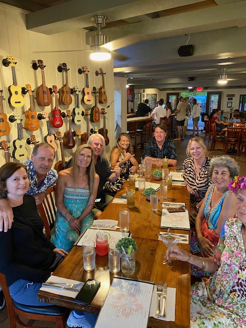 I covered Sat. lunch in last blog. My architect Mireille and husband Harold flew in and we all had dinner at the Ranch restaurant Saturday night. A new treasured friend, Carol, had the haku lei made and surprised me at the restaurant.