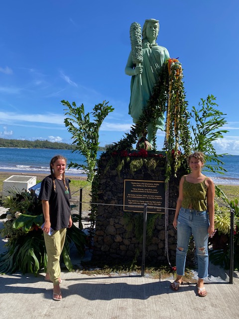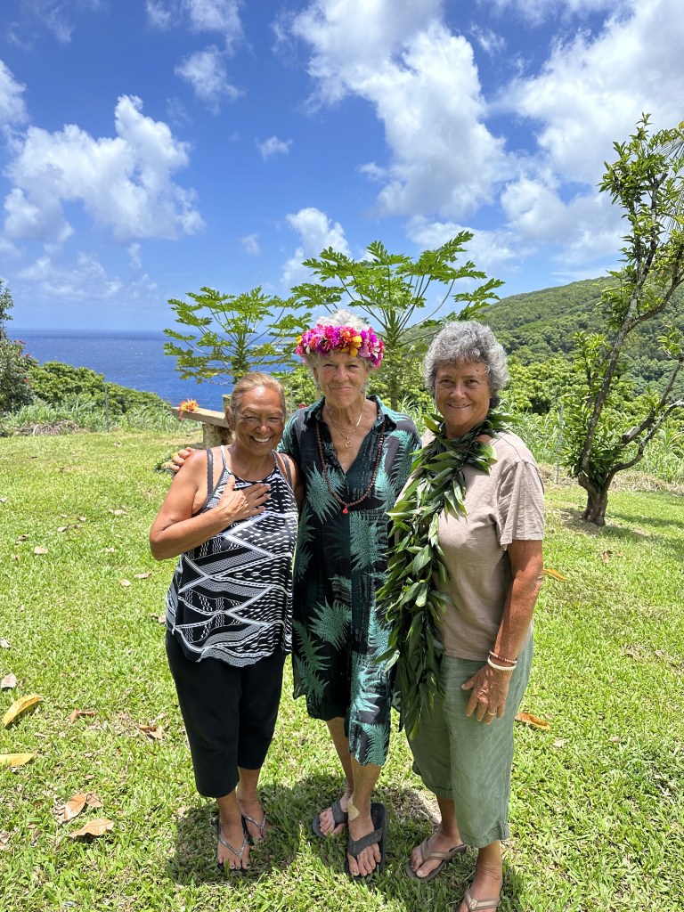 Sunday morning my two friends and major helpers Alana and Megan arrived on the early plane into Hana.On the way back we went to the bay to see the Saturday unveiling of the Queen Ka’ahumanu statue. Ka’ahumanu was the daughter of the Great Maui King Kekaulike and Ha’alo’u. She was born in a cave just around the corner from the Bay. The statue is a beautiful addition to the Bay which is a meeting, swimming, canoeing and resting place.