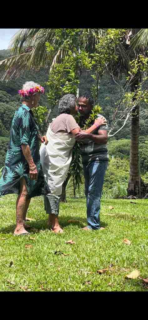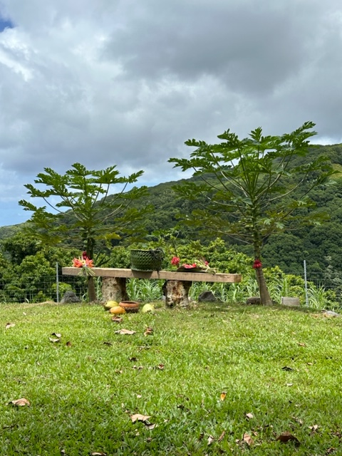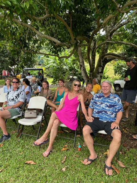 The land blessing on Monday was beyond fabulous! After six months of talking on the phone and planning a date, it finally happened! Lei’ohu Ryder along with her partner Maydeen ‘Iao drove out from Kula. Lei’ohu is a Hawaiian spiritual leader, visionary, singer/songwriter, healer, and educator. They are truly Kumu with amazing Aloha. They did a magnificent job and it was the best having them along with so many friends and family here on this special land. After the ceremony we all enjoyed a delicious lunch prepared by chef minded farms under the fragrant Pak Lan tree.