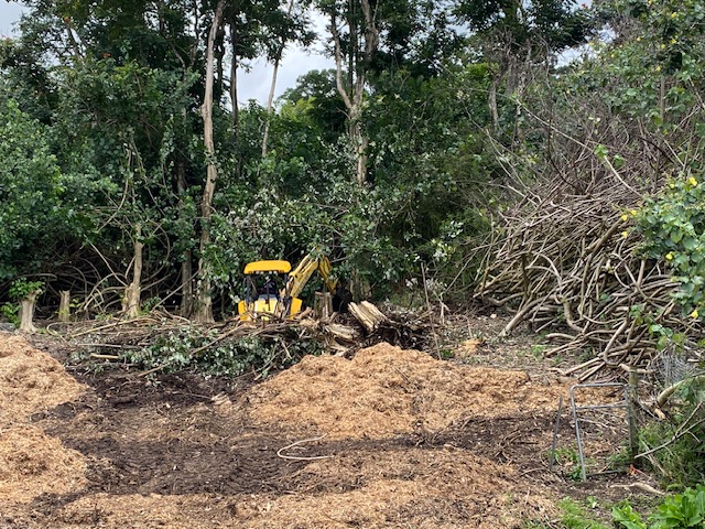 Bradley and boys spent a couple days here taking out the hau and tulip roots. Now the job is to spread out the hau chips that are in piles and get rid of six more tulip trees.
