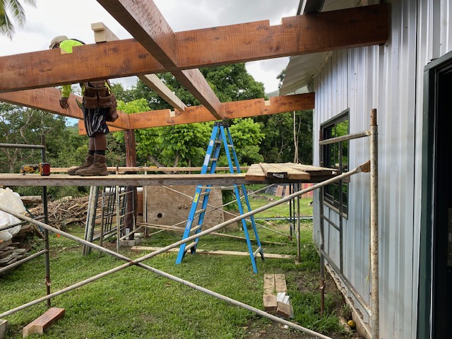 Work progresses on the ocean side patio roof. There is even work today being done on the cross beams so when the roofing arrives it will go right on in one day.