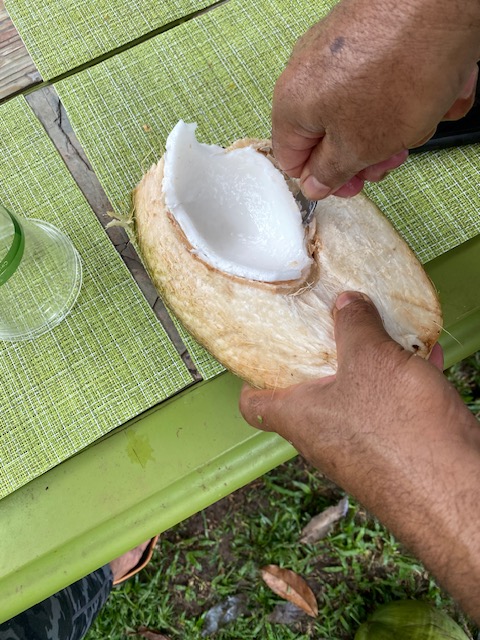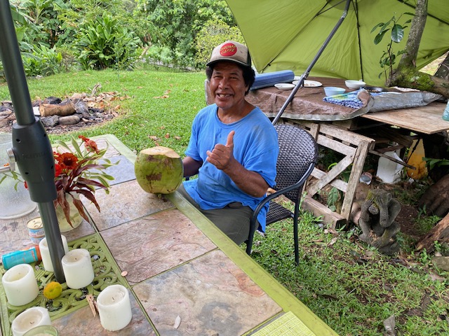 Over the weekend we did have time for some fun. Derek, who also came to help brought bananas and a batch of coconuts.We drank the water and ate the coconut. Friday night we joined a group of friends for pizza and music. And, we had some great meals around the fire.