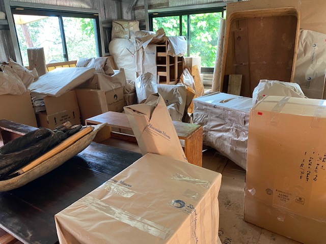 It is FINALLY happening! Ten large crates of my “stuff” were delivered Thursday afternoon by Sam at Redo Trucking. Sam is the man who brings in all the food and materials for the Hana Hotel and Hana Ranch. His biggest truck could only bring half the load in one trip from Royal Hawaiian Movers storage in Kahalui. It was quite an operation as he was able to get up this challenging driveway. Then one at a time he unloaded each crate with his forklift.