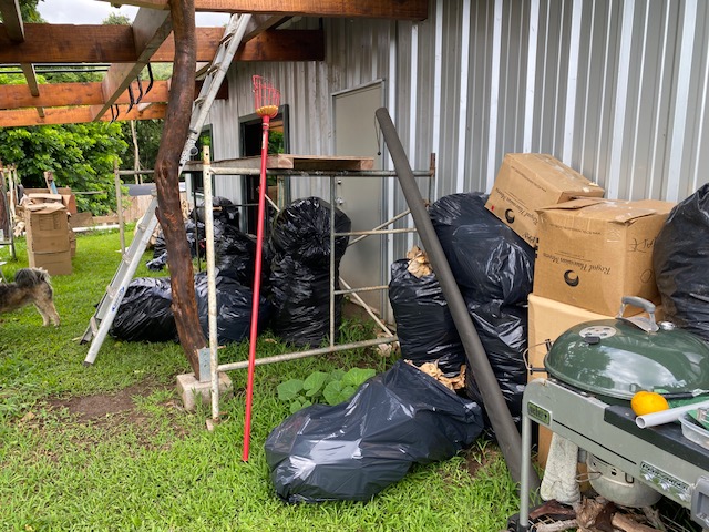 We have also been cleaning up all the paper and many boxes from the shipping that have littered the yard. The cardboard boxes are broken down and used as a first step on weed barrier for planting the coconuts. There were boxes and black garbage bags filled with paper everywhere. I found some African gardenias and yellow hibiscus at the farmers market yesterday so am getting space to plant them. Planting space is limited as there will be more excavator ground work needed before I have free spaces to plant.