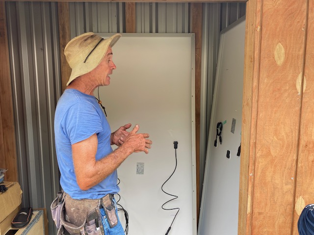 The solar shed is built and the solar will be installed today baring no rain. Cory has to get on the roof to install the panels so it cannot be wet. I bought standing seam metal roofing so the panels just snap on without drilling holes in the roof. When this is up and running life will take on a new dimension. I now have to run the gas generator everyday for a few hours to compensate for the failing Eco Flo solar generator.