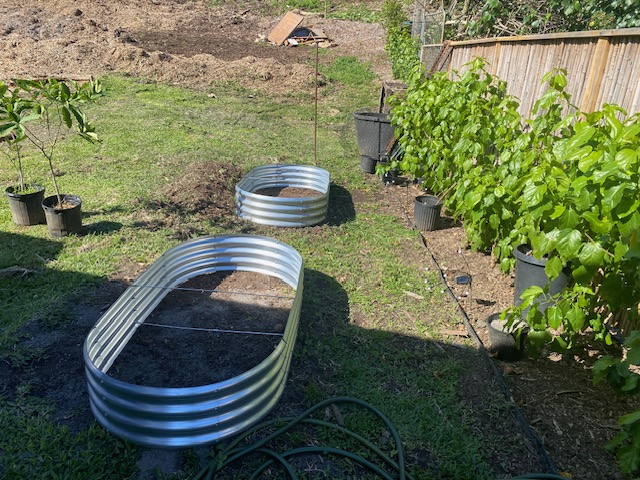 I am working on getting the back yard cleaned and thinking about planting the first raised beds. There are now three beds almost ready for filling and planting.