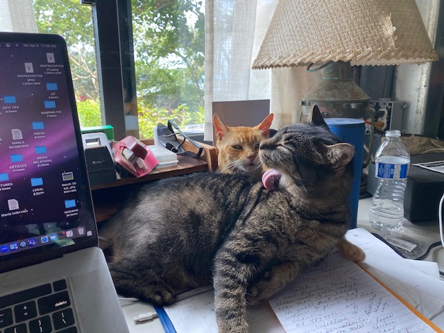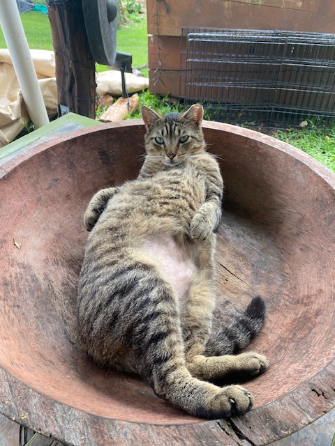 The cats seem happy in spite of the off and on rain and cool weather. The kitten wandered in with a mother and brother and I am in the process of trapping and getting them neutered. The process is much more difficult here, but will hopefully happen asap with the help of my new friend Sharon from the HHS.