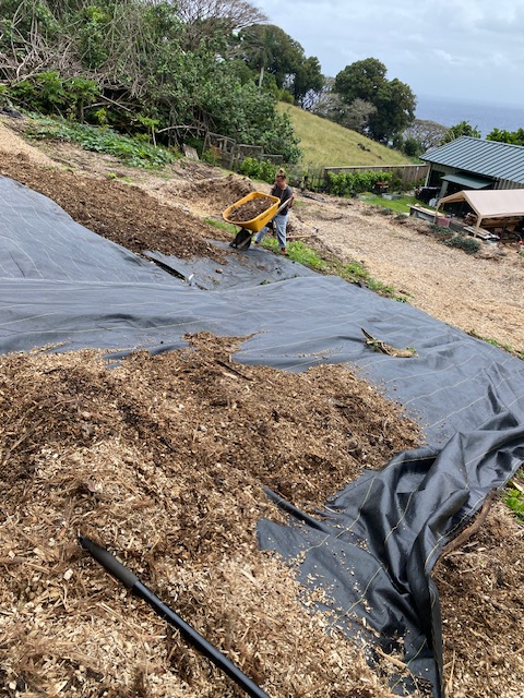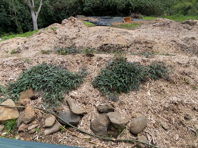 We continue putting down weed barrier cloth and spreading chips on top. The hill terraces are looking better and better each week. Now we are waiting for another roll and ground steaks which I will get this next on my next trip to town. Kira is a great worker.
