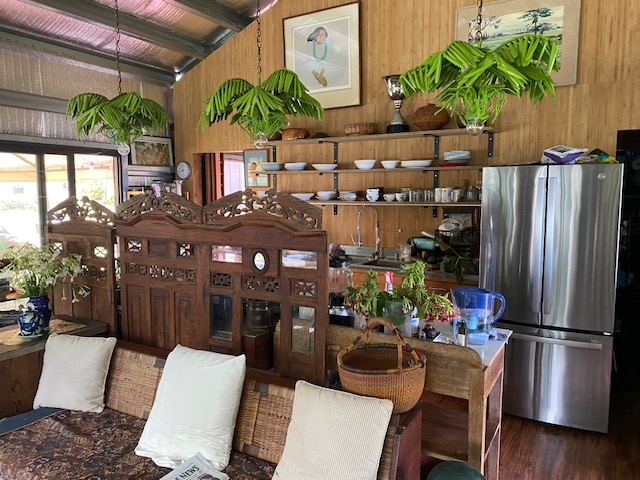 Here are the coconut lights finally installed. These are lights Bob and I flew up to Kauai to cut out of the ceiling at the Coco Palms before demolition. After sitting in dirty garages for many years I dug them out, painted them and had them rewired. They are now over my cooktop.