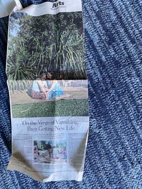 I had some important visitors a couple of days ago from the Pu’uhonua Society-Maile Meyers and her daughter Emma Broderick along with three other young women. They came out to see our coconut and Kalo project and are showing a historical film this evening at Ala Kukui cultural center here in Hana. Maile and Emma made the front page of the New York Times Arts August 1 edition. Very exciting story that also showed Indrajit and Manu Meyer’s Niu Now Project.