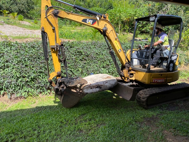 Laka came for the last excavator work-finalizing the water tank pad, reshaping the shed entrance driveway, and taking this big piece of concrete out of the back yard down to where the pool will be located. I am now working on landscaping the back yard.