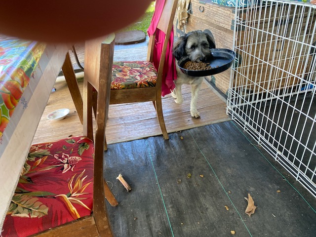 The neighbors dogs drop by every once in a while because they are not being fed at home. I fell in love with the little black oneput some food out, but Mana decided to bring the dish back which she did without spilling a drop.