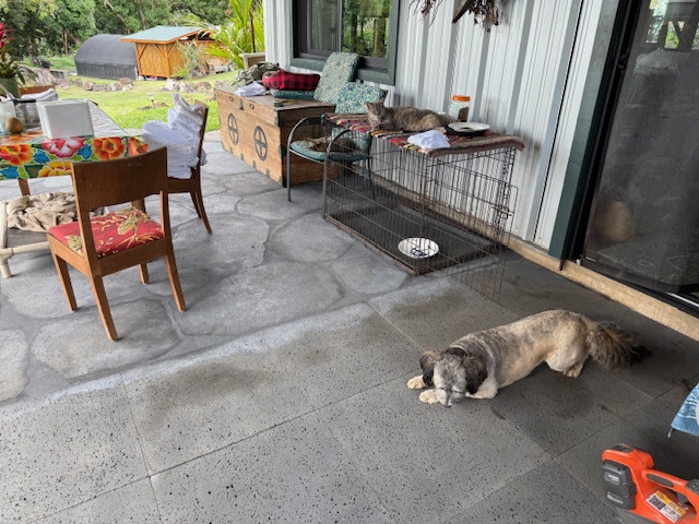 Just before leaving both patios were almost finished and after all the months of being on weed cloth it is a real joy. The black stones in front hold the heat and are very popular with the cats in the afternoon. We are waiting for more material for a small section and then it will be all finished.