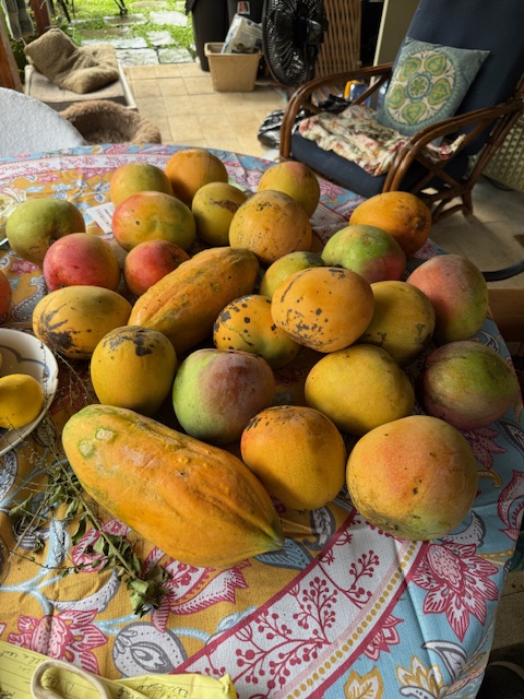 I was able to get a big bunch of beautiful mangos and am going to process them for chutney. Tenzen and Sarah have a farm and raise the best papayas ever. They were leaving on a trip so they just gave me all this fruit.