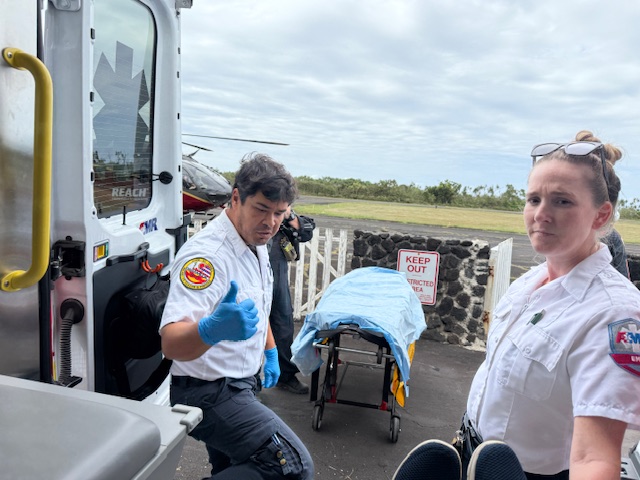 But after a day I was still with a fast heart beat.and feeling awful. After my experience at Maui Mem several years ago with my broken arm I didn’t want to go there again. Saturday Morning I bought a one way ticket to Honolulu on Mokulele so I could get to Straub where all my doctors are located. I knew I couldn’t navigate the Kahalui airport with a change of planes and separate airport. The Mokulele flight took 3.5 hours stopping at various places, but seemed like a safer bet. I got Dana to come out and stay and packed my bag. I texted our neighbor, a retired emergency room nurse, who watches the place from up above telling her that I would be leaving for a few days. She texted back immediately, “I am coming down there right now”. So down she came in her brightly colored new golf cart. She took one look at me and said,” Vicky we are calling 911 right now and you have to go to Maui Memorial. I was just there with Walt and it has improved greatly.” So, I agreed and the ambulance was here before we knew it. Since the drive way is still narley she took me to the bottom of the hill to meet the ambulance. They loaded me in, put in an iv and headed out. As we were heading down the road the driver asked if I wanted a 2.5 hour ambulance ride or a helicopter ride. I told him I had never been I a helicopter and that sounded better. By the time we arrived at the Hana Airport the big black helicopter was there with the REACH team all dressed in black jumpsuits with white helmets. VERY impressive to say the least.