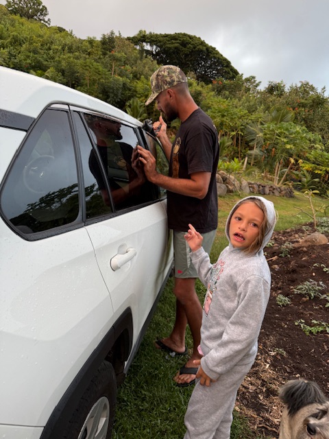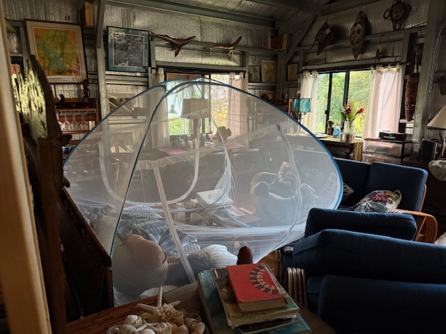 It has been a very fun social week with company for a few nights and three dinners out with friends. Two of my grandson Rhodes’ friends, Taylor and Charlie, were on the other side of Maui for a wedding and came to visit me here in Hana. Being surfers from Southern California they were blown away with life and the natural beauty at the jungle’s edge. They helped me with a couple of projects, I showed them some of the sights in the area, and we had some nice meals and nightly fires. They loved it so much and want to return as cat and farm helpers. They both slept in the front room under mosquito netting.