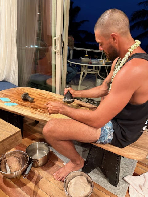 Friday was James and Moie’s fifth wedding anniversary and they had a gathering of friends and family to celebrate. James had picked taro from here and pounded poi as one of the many items served. There was lots of lively conversation including the Molokai to Oahu canoe race that took place last Sunday. Hana had a crew that paddled in a koa canoe. The crew paddled the canoe from Maui to Molokai on Thursday, rested for a couple of days and then the race on Sunday which took six hours. There were some very fun stories…..