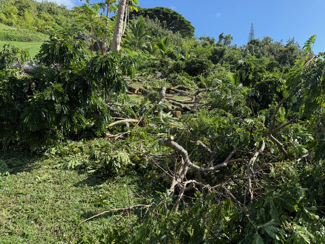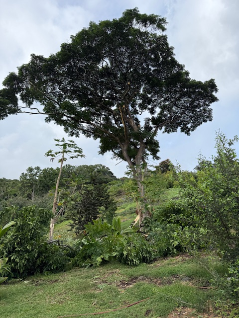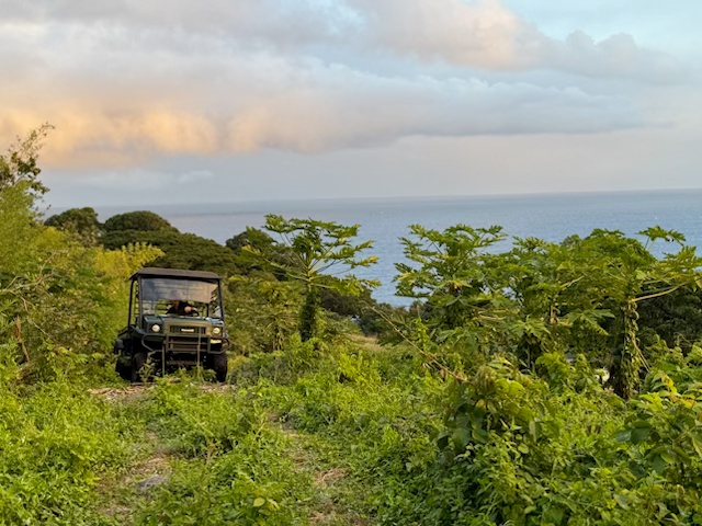 I finally drove my Kawasaki mule to the top of the property bouncing off big rocks. I was giving Susan a tour and we both were amazed at the beauty. Those papaya trees are full of fruit. That was where Bob’s parents wanted to build a weekend house.