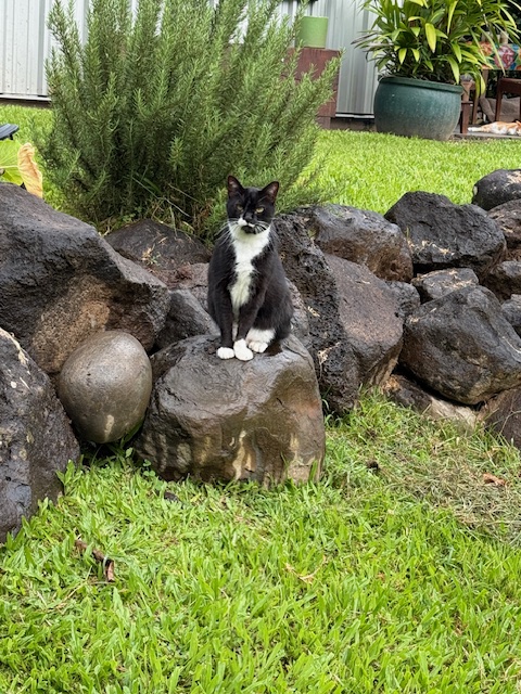 The cats are all doing well and I have to take more pictures. Here is Casper enjoying himself on the rock wall. He goes all over the property and is the big boss here.