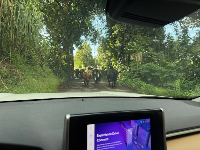 This morning I was rehoming a mongoose and came across a real old fashioned cattle drive moving the herd from one pasture to another down the Hana Hwy. As I sat there in my car I was hoping they would keep walking past-and they did.