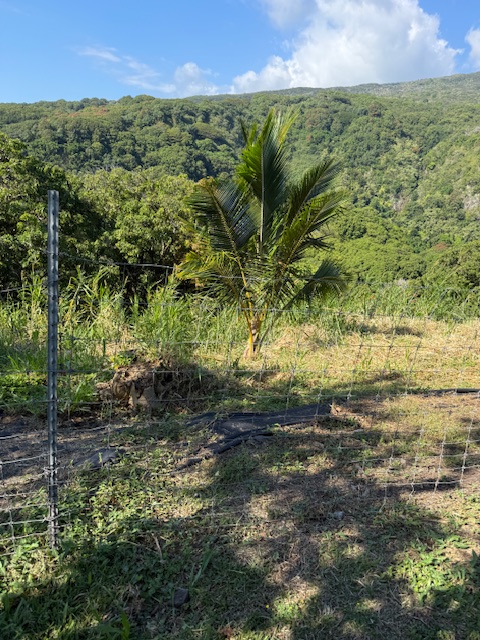 And speaking of trees the niu planted on the hill are growing at record speed. Some of the seedings planted in April 2024 are now ten feet tall or higher. This is because the earth was covered with Hou for over fifty years and is very fertile. This is the first tree we planted on the edge of the sheer forty foot drop off to the road below. Indrajit thinks it is the revered Niu Hiwa, a tree that faces significant conservation challenges today. “The tree is historically esteemed and is a distinctive, identifiable coconut variety with unique cultural practices tied to it and the loss would have significant implications for Native Hawaiian culture today.” (Gunasakara)
