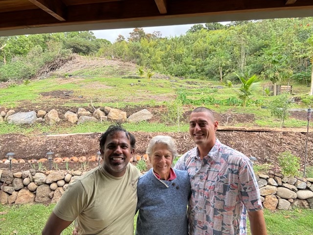 This week has been a real adventure -the beginning of an event I have been dreaming of for twenty five years! Chase made the rest of the big clear with his Komatsu excavator. That Machine picks up giant tree trunks like they were match sticks and rips up huge piles of hau with one scoop. I took some great video shot of this work in action, but unfortunately they are too big to post on the blog. Yesterday was the last day of five days work. Chase has been operating that machine since he was a teenager and is a master and the progress is very exciting. On the side of the machine there is a small seat which I rode on while he drove up to a high spot on the hill. It was kind of scarey as we bumped along the newly cleared path. From the flat place on the top we could see Mauna Kea, Mauna Loa, Hualalai and Kohala-all amazing views that I had no idea would ever be visible. From there we hiked up the trail to the pool and waterfall. There has been very little rain, but the water fall is still going and we all jumped in the pool for a cold swim. It was a memorable day for me. There is still a lot of hand clearing which will be the next project. With the major clearing made possible with the Reforesting Green Grant the next phases are workable.