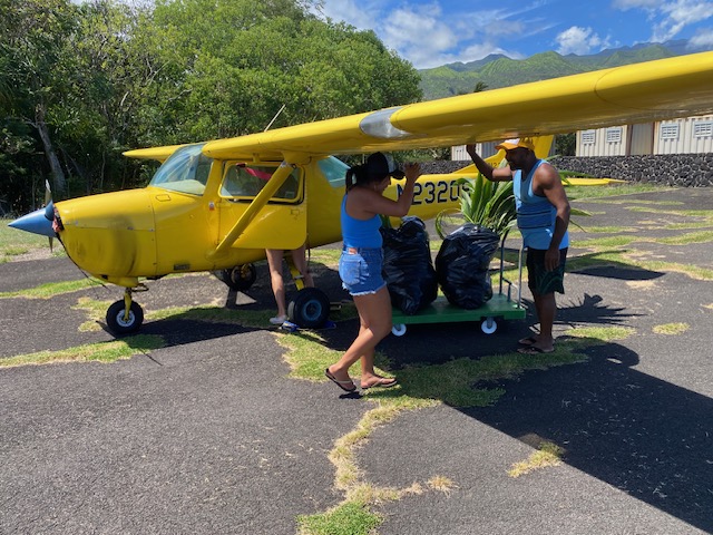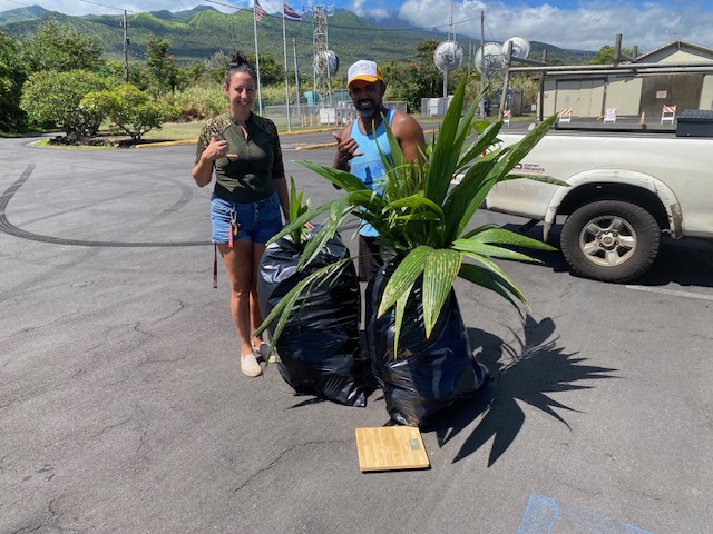 We have also been cleaning up all the paper and many boxes from the shipping that have littered the yard. The cardboard boxes are broken down and used as a first step on weed barrier for planting the coconuts. There were boxes and black garbage bags filled with paper everywhere. I found some African gardenias and yellow hibiscus at the farmers market yesterday so am getting space to plant them. Planting space is limited as there will be more excavator ground work needed before I have free spaces to plant.